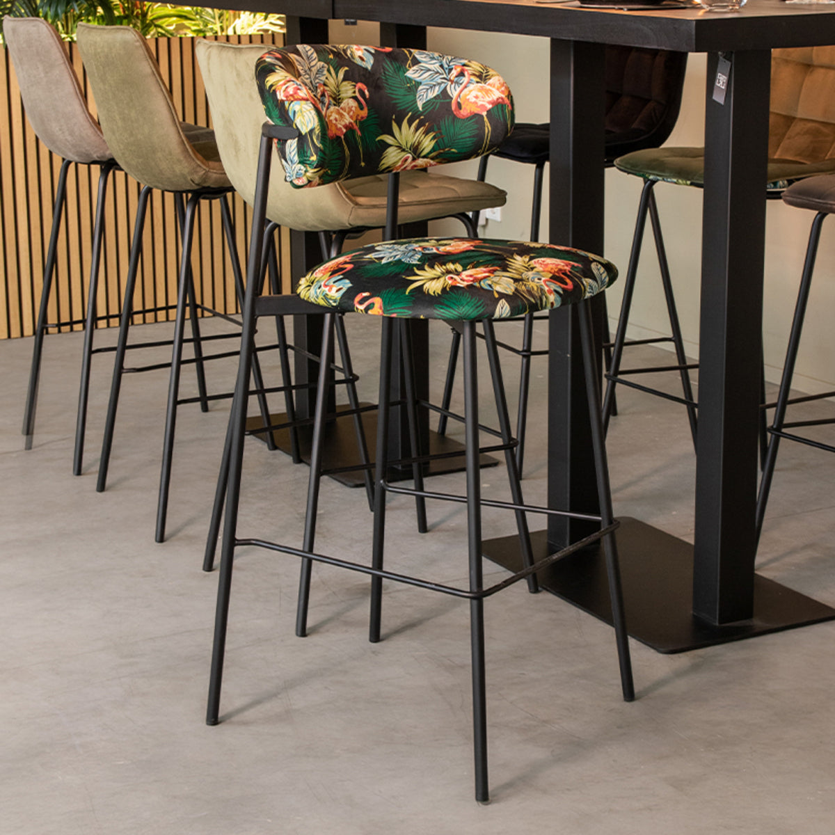 LABEL51 - Barkruk Ferry 46x52x107 cm - Printed Flamingo Fluweel | Zwart Metaal